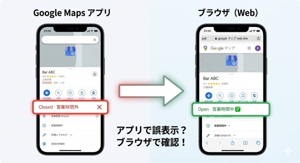 現在、iPhoneのGoogleマップアプリから当店を確認した際、営業中であっても「営業時間外」と表示される不具合が一部で発生しております。